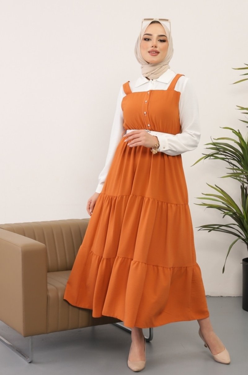 Bestenur Taba Askı Detay Yarım Düğme Kemerli Ayrobin Mans Elbise