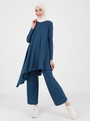 Refka Petrol Pamuk Kumaşlı Asimetrik Kesim Tunik & Pantolon İkili Takım