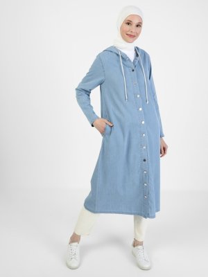 Benin Buz Mavisi Doğal Kumaşlı Kapüşonlu Kot Kap