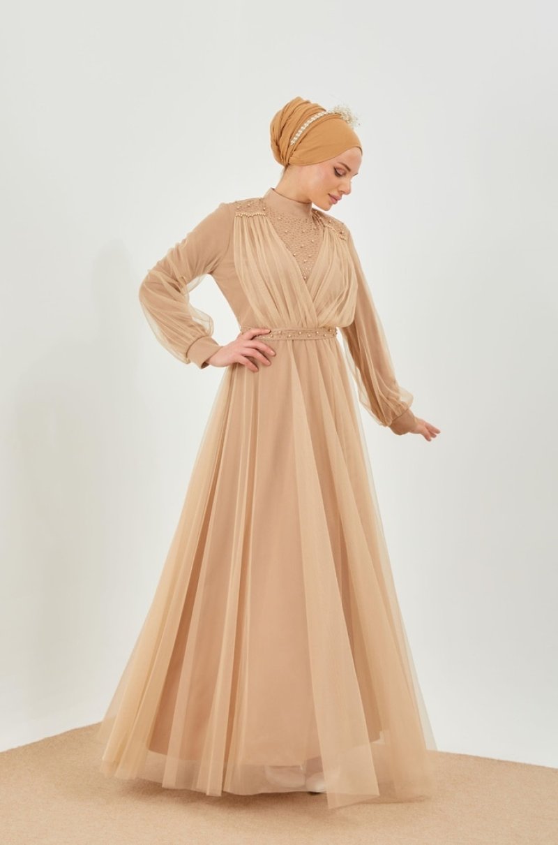 Moda Echer İnci Görsel Detaylı Abiye Elbise Açık Taş
