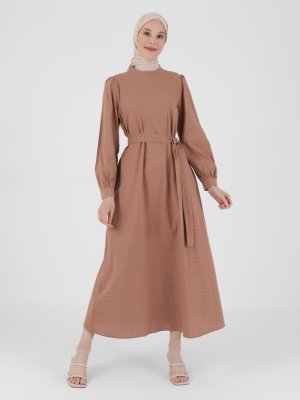Refka Açık Kahve Doğal Kumaşlı Kuşak Detaylı Elbise