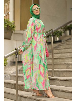 İmaj Butik Yeşil Desenli Saten Elbise
