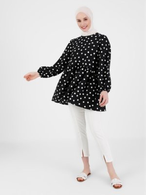 Benin Siyah Balon Kol Puantiye Desenli Tunik