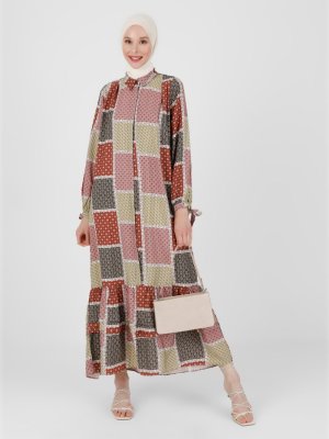 Refka Kahve Patchwork Desenli Bağcıklı Viskon Elbise