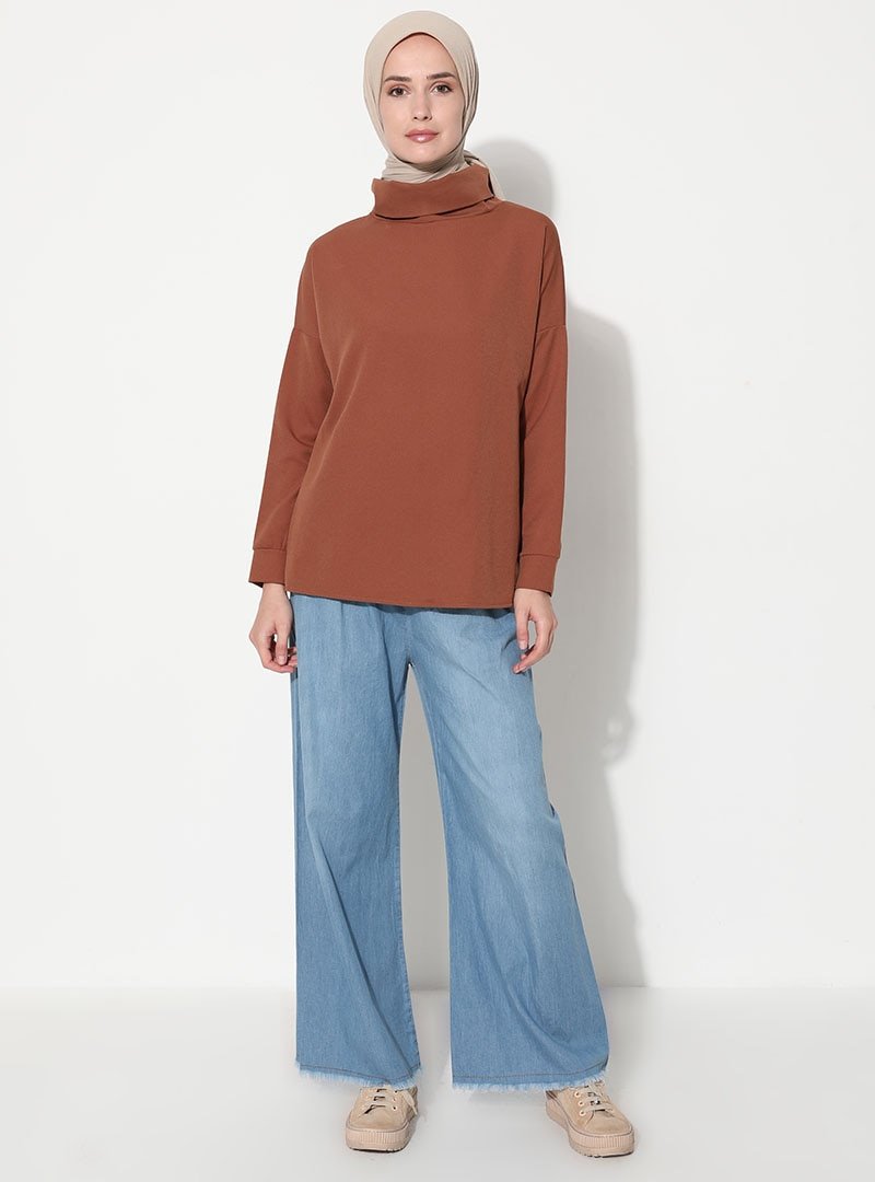 Tesettür Dünyası Mavi Beli Lastikli Bol Paça Kot Pantolon