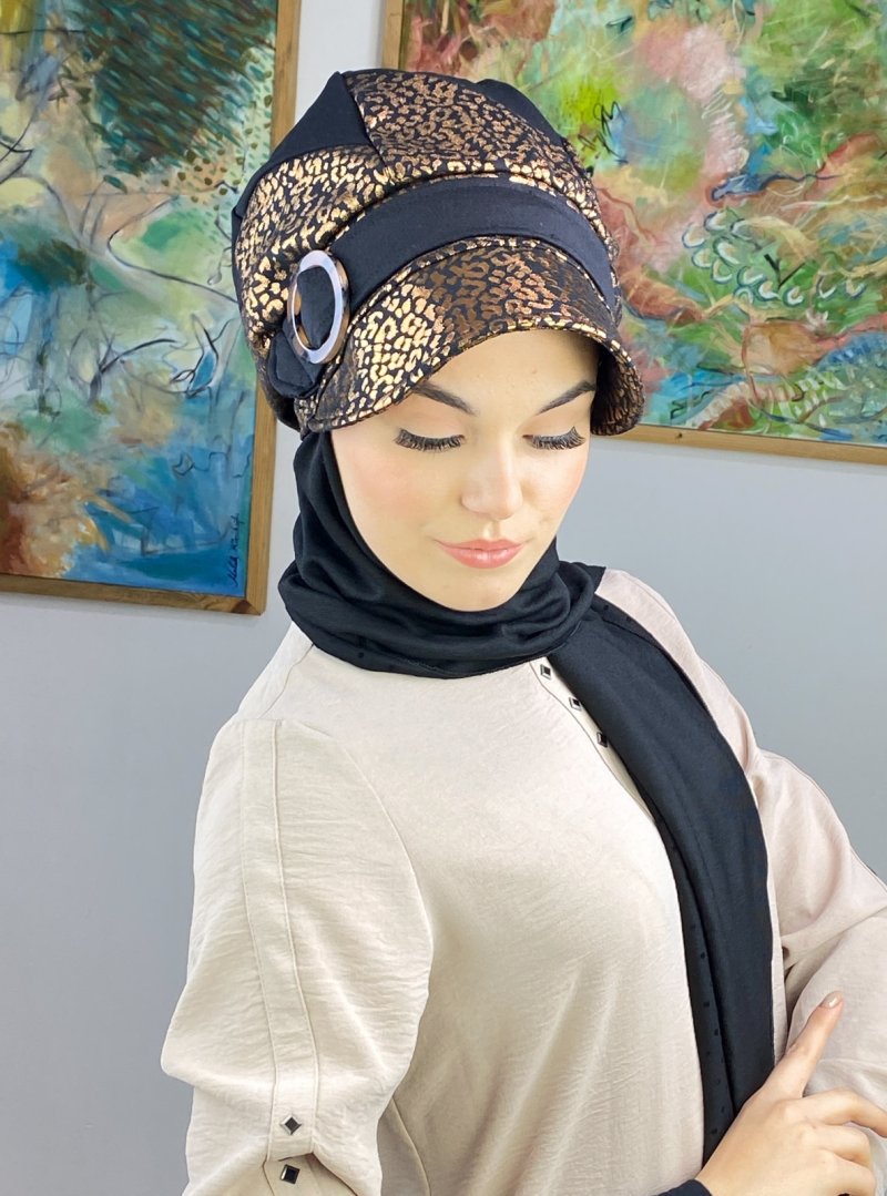 BUTİK AMBAR Siyah Parlak Bakır Leoparlı Çarkıfelek Model Tokalı Atkılı Şapka