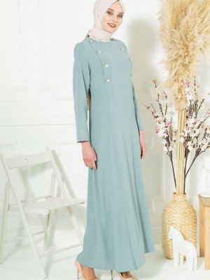 Beyza Mint Yeşil Taş Düğme Detaylı Elbise