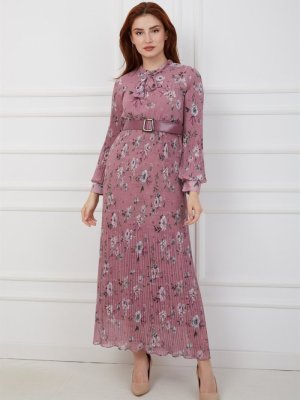 Olcay Lila Kolu Ve Eteği Piliseli Kemer Detaylı Desenli Elbise