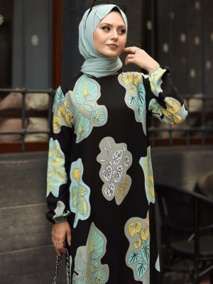 Tesettür Vagonu Lotus Yaprağı Desenli Eteği Fırfırlı Hakim Yaka Elbise