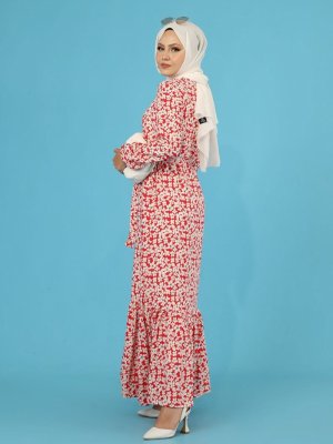 Tesettür Vagonu Nar Çiçeği Zemin Minik Çiçek Desenli Kuşaklı Eteği Fırfırlı Bisiklet Yaka Elbise