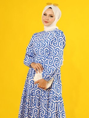 Tesettür Vagonu Mavi Geometrik Desenli Kuşaklı Elbise