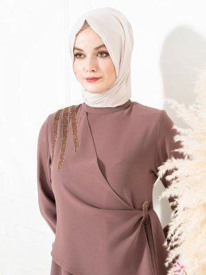 Beyza Kahve Yapıştırma Taş Detayı Olan Elbise