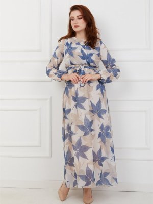 Olcay Bej Önü Volan Detaylı Desenli Şifon Elbise