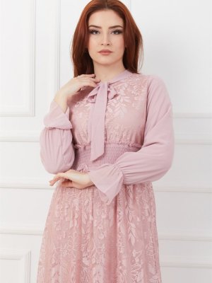 Olcay Pudra Beli Büzgülü Dantelli Elbise