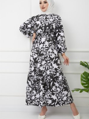Olcay Siyah Beyaz Hakim Yaka Eteği Fırfırlı Çiçek Desenli Elbise