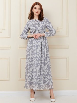 Olcay Gri Pilise Ve Fırfır Detaylı Şifon Elbise