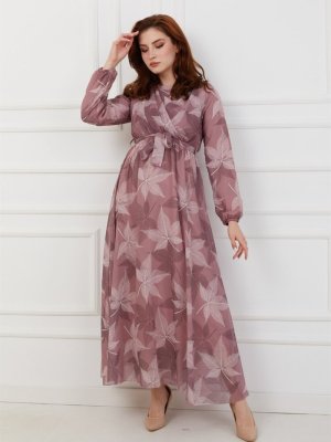 Olcay Gül Kurusu Önü Volan Detaylı Desenli Şifon Elbise