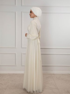 Egelin Ekru Uzun Drape Kol Güpür Detaylı Şifon Abiye Elbise