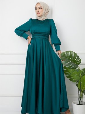 Olcay Yeşil Beli Pilise Detaylı Kuşaklı Abiye Elbise