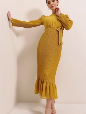 Saygı Giyim Hardal Eteği Fırfırlı Beli Kuşaklı Astarlı Piliseli Uzun Şifon Abiye Elbise