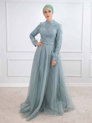 Egelin Su Yeşili Hakim Yaka Tüy Detaylı Kol Abiye Elbise