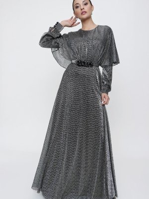Saygı Giyim Siyah Beli Boncuk Detaylı Kuşaklı Astarlı Simli Uzun Abiye Elbise