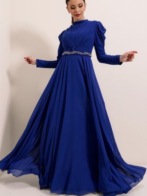 Saygı Giyim Saks Önü Düğme Detaylı Pileli Beli Boncuk Kemerli Astarlı Uzun Şifon Abiye Elbise