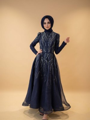 Egelin Lacivert Simli Kumaş Taş İşlemeli Abiye Elbise