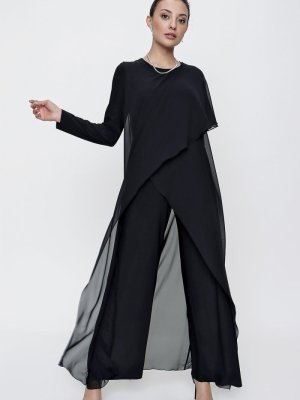 Saygı Giyim Siyah Uzun Kollu Üstü Şifon Likra Tulum
