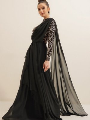 Saygı Giyim Siyah Üstü Pullu Yaldızlı Altı Astarlı Volanlı Şifon Uzun Abiye Elbise