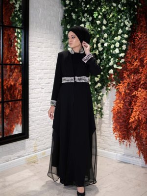 Egelin Siyah Yaka Kol Ve Kemer Taş Detaylı Abiye Elbise