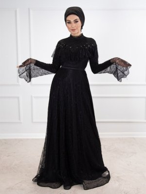 Egelin Siyah Boydan Dantel İspanyol Kol Abiye Elbise