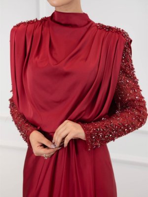 Egelin Bordo Kol Taş İşleme Saten Kırmızı Abiye Elbise