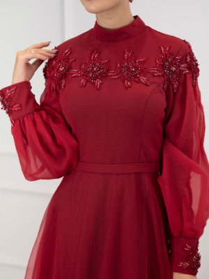 Egelin Bordo Balon Kol Bilek Ve Göğüs Hareketli Tül Abiye Elbise