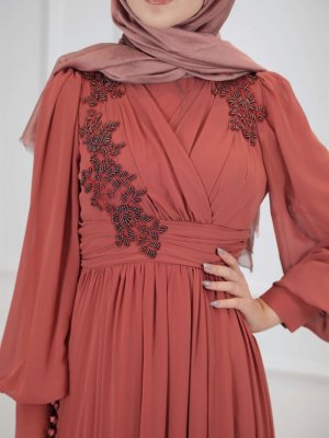 Egelin Tarçın Omuzdan Üç Boyutlu Çiçek İşleme Drapeli Şifon Abiye Elbise