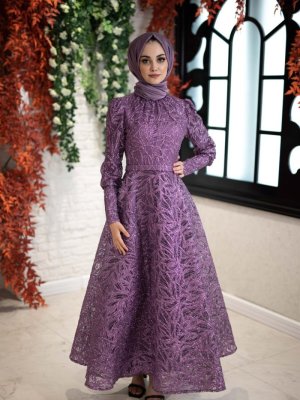 Egelin Mor Kendinden Desenli Simli Helen Abiye Elbise