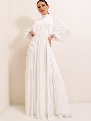 Saygı Giyim Ekru Önü Düğme Detaylı Kolları Pileli Astarlı Uzun Şifon Abiye Elbise