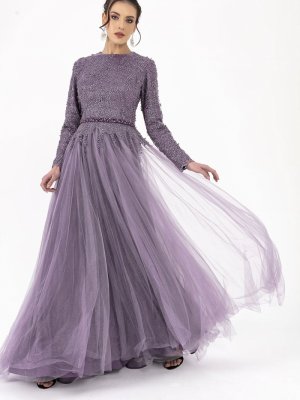 Saygı Giyim Lila Üstü Güpür Volanlı Uzunkol Abiye Elbise