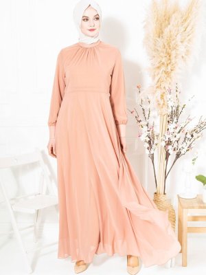Beyza Şeftali Halka Kemerli Şifon Abiye Elbise