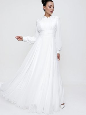 Saygı Giyim Ekru Taş İşlemeli Pileli Uzun Şifon Abiye Elbise