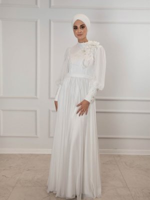 Egelin Ekru Omuz Aksesuar Detay Şifon Beyaz Abiye Elbise