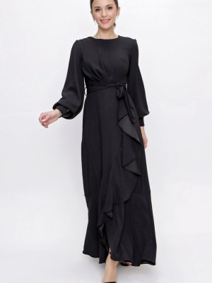 Saygı Giyim Siyah Koları Düğmeli Beli Kuşaklı Volan Detaylı Astarlı Krep Saten Uzun Abiye Elbise
