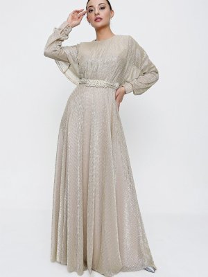 Saygı Giyim Gold Beli Boncuk Detaylı Kuşaklı Astarlı Simli Uzun Abiye Elbise