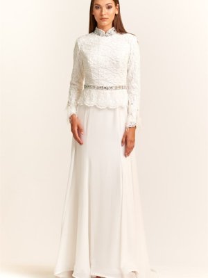 Egelin Krem Uzun Kol Tül Ve Kemer Detaylı Balık Abiye Elbise