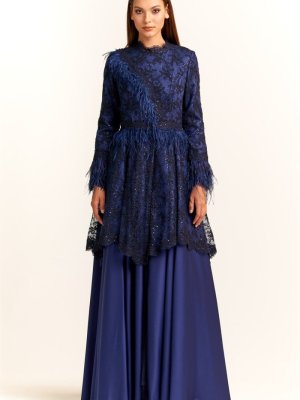 Egelin Lacivert Uzun Kol Tüy Ve Güpür Detaylı Abiye Elbise