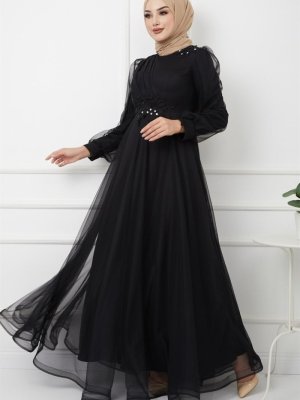 Olcay Siyah İşleme Ve Pilise Detaylı Volanlı Abiye Elbise