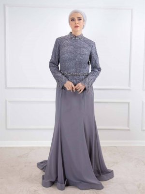 Egelin Gri Belden Tül Kuyruklu Abiye Elbise