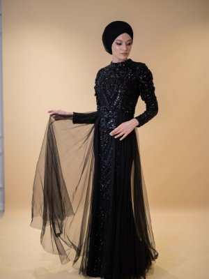 Egelin Siyah Pul Payetli Tül Kuyruklu Balık Abiye Elbise