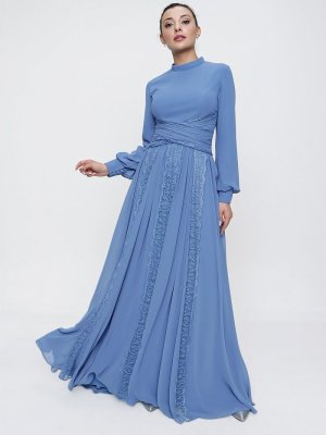 Saygı Giyim İndigo Beli Piliseli Dantel Detaylı Astarlı Uzun Şifon Abiye Elbise