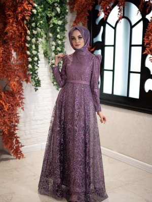 Egelin Lavanta Kendinden Simli Kumaş A Kesim Mor Abiye Elbise